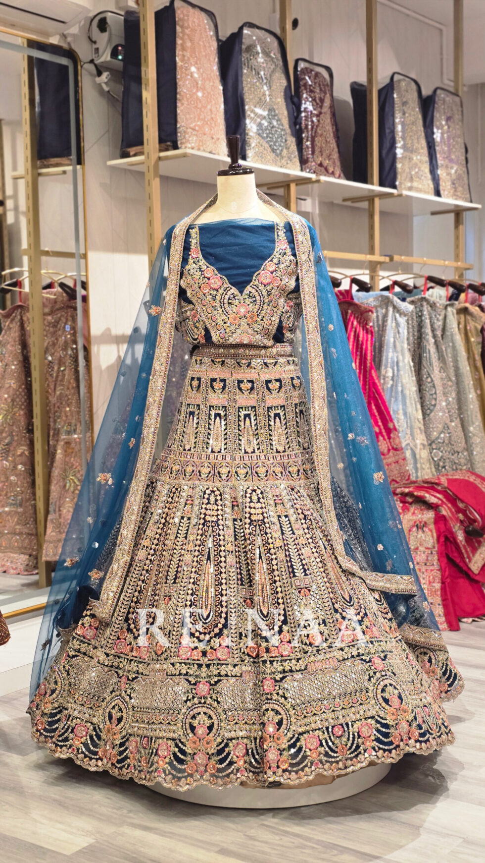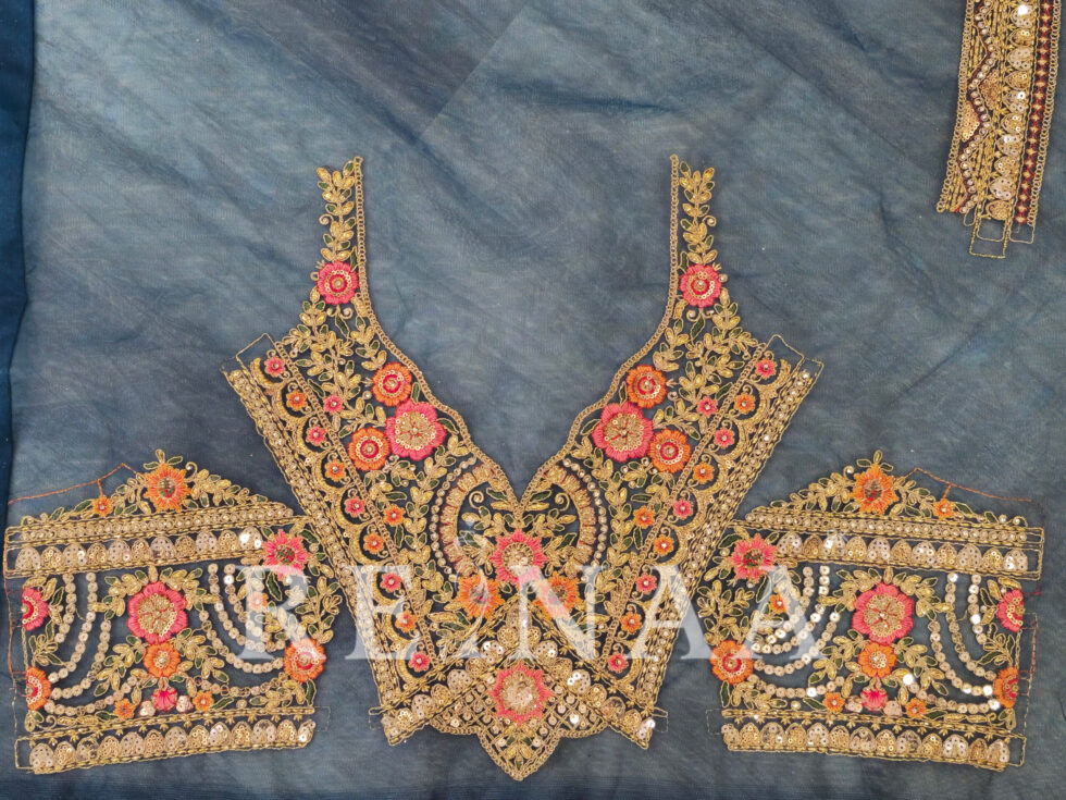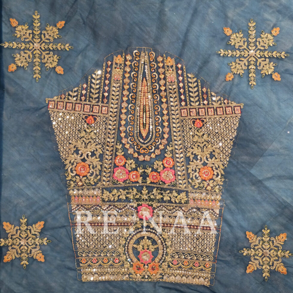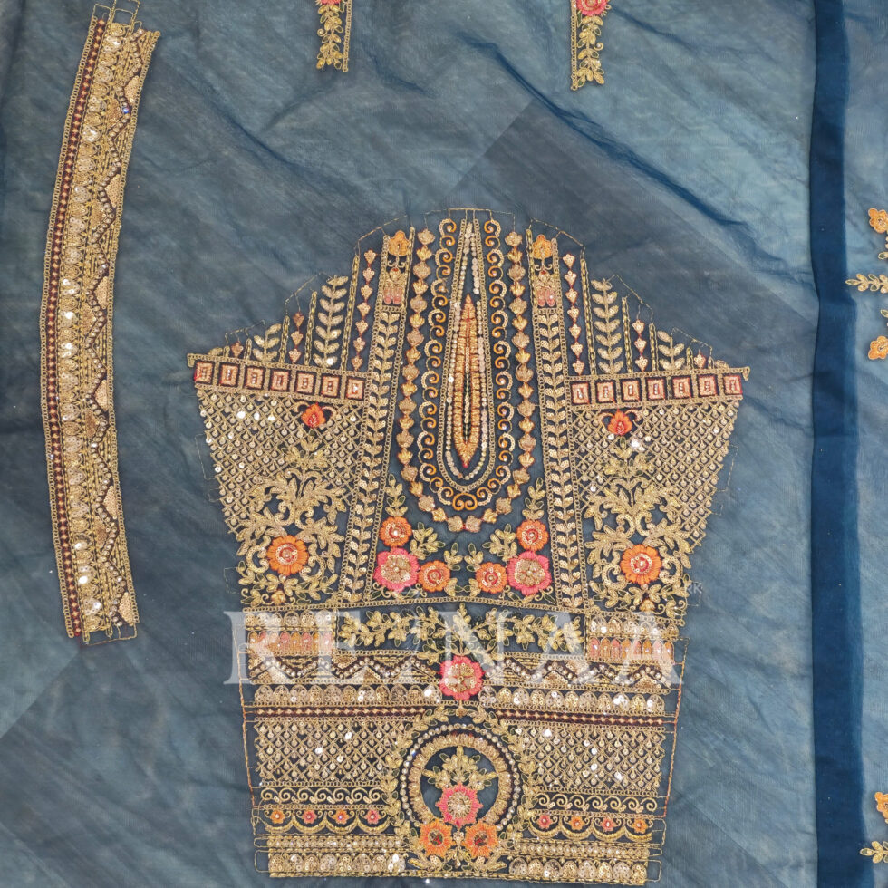 A stunning blue panel-cut lehenga crafted with symmetrical embroidery on every panel for a neat and refined finish.